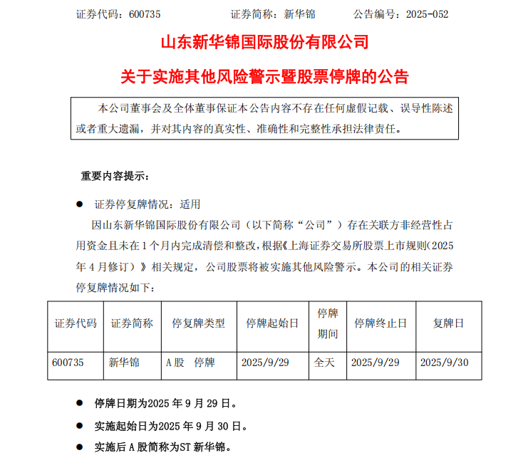 新华锦将被实施其他风险警示,主要是其存在关联方非经营性占用资金问题,并且未在1个月内完成清偿和整改。