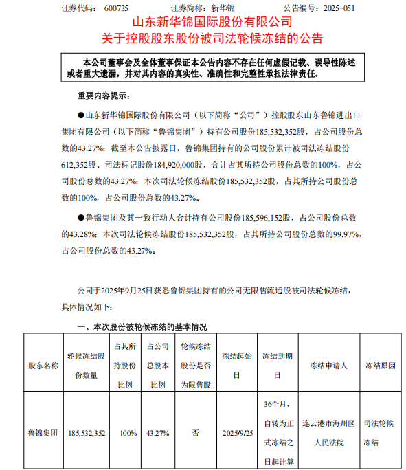 目前,鲁锦集团深陷股权质押、冻结的困境。截至9月26日,鲁锦集团持有新华锦1.86亿股股份,但是累计被司法冻结、司法标记的股份,合计占其所持新华锦股份(000059)总数的100%,占新华锦股份总数的43.27%。